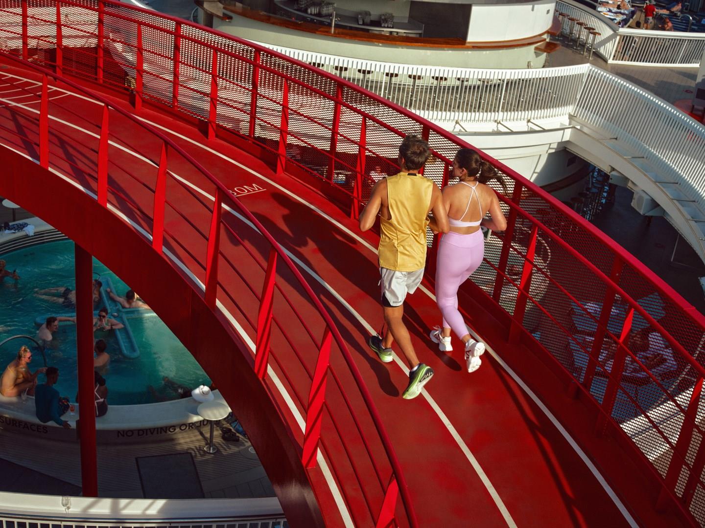 Our signature, Virgin-red running track forms a (255 meters-ish) halo-like vision over the ship, allowing you to sweat, strut or stroll. Because for some of us, the only kind of running we do is… from our problems. And don't forget the SPF — The Runway is outside and the sun, unlike our problems, will catch up with you no matter how fast you run.